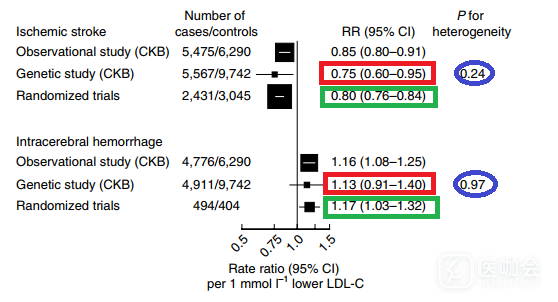 在对降LDL-C药物治疗的全球随机试验的Meta分析中,LDL-C每降低1 mmol/l,IS的RR为0.80(95%CI:0.76~0.84),ICH的RR为1.17(95%CI:1.03~1.32),如图2所示。从随机试验中得到的风险估计与CKB观察性研究以及基因研究中的风险估计高度一致。
