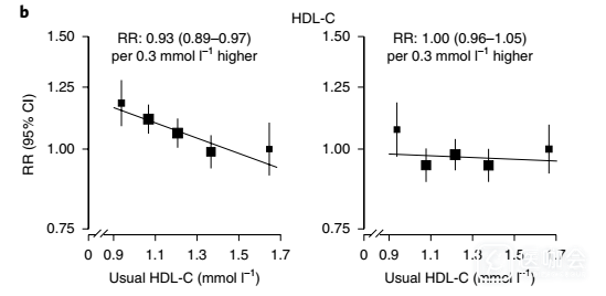 反过来,LDL-C每降低1 mmol/l,IS的风险降低15%(RR=0.85,95% CI:0.80~0.91),ICH的风险升高16%(RR=1.16,95% CI:1.08~1.25),如图1a所示。