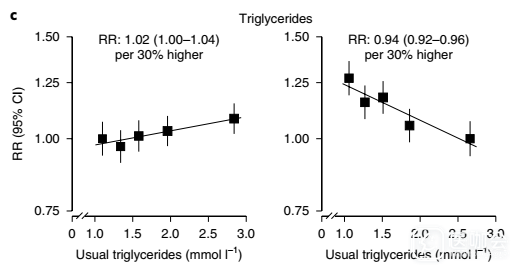 甘油三酯浓度与IS风险呈比较弱的正相关关系(甘油三酯每升高30%,RR=1.02,95%CI:1.00~1.04);与ICH风险存在负相关关系(甘油三酯每升高30%,RR=0.94,95% CI :0.92~0.96),如图1c所示。