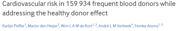 Cardiovascular risk in 159 934 frequent blood donors while addressing the healthy donor effect. Heart. 2019 Mar 14. pii: heartjnl-2018-314138.