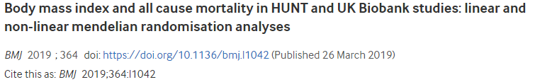 Body mass index and all cause mortality in HUNT and UK Biobank studies: linear and non-linear mendelian randomization analyses. BMJ 2019;364: l1042