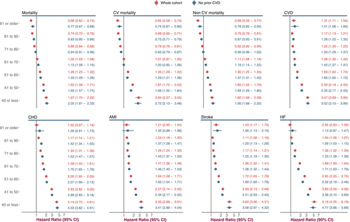 图2:相较于非T2DM对照组,既往无CVD病史(红色)及总体(蓝色)T2DM患者根据不同诊断年龄的校正后风险(HR)