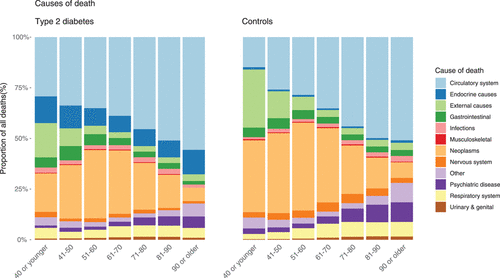 图3:不同诊断年龄的T2DM与匹配对照组的死亡原因