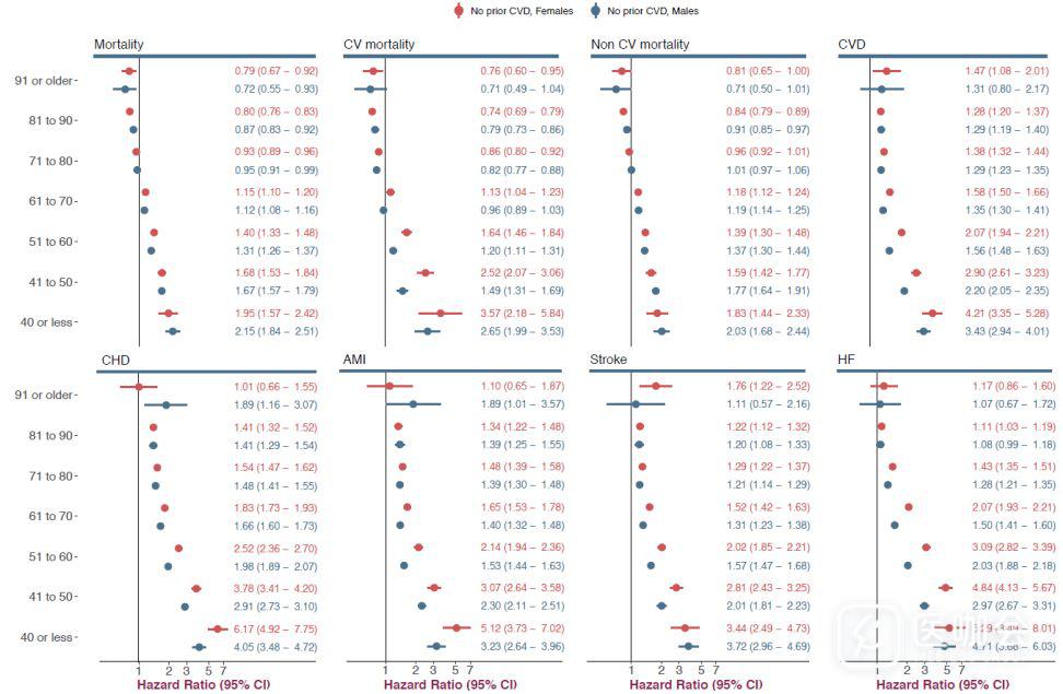图4:相较于非T2DM对照组,既往无CVD病史的女性(红色)及男性(蓝色)T2DM患者根据不同诊断年龄的校正后风险(HR)