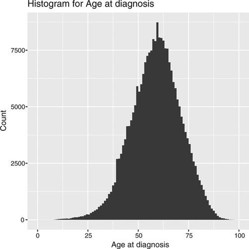 T2DM患者诊断的平均年龄为61.79岁,其年龄分布可见图1。对T2DM患者的诊断年龄进行分层,发现诊断T2DM时的年龄越小,BMI、HbA1C水平、甘油三酯水平更高,HDL-C更低,但血压则随着年龄增大而更高。