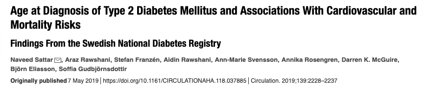 参考文献:Age at Diagnosis of Type 2 Diabetes Mellitus and Associations With Cardiovascular and Mortality Risks. Circulation. 2019 May 7;139(19):2228-2237.
