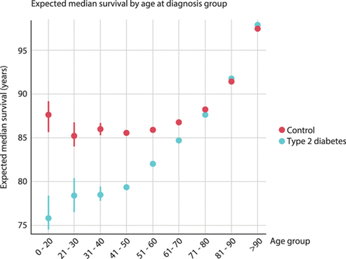 图5:无CVD病史的T2DM患者中根据诊断年龄的预期生存年龄