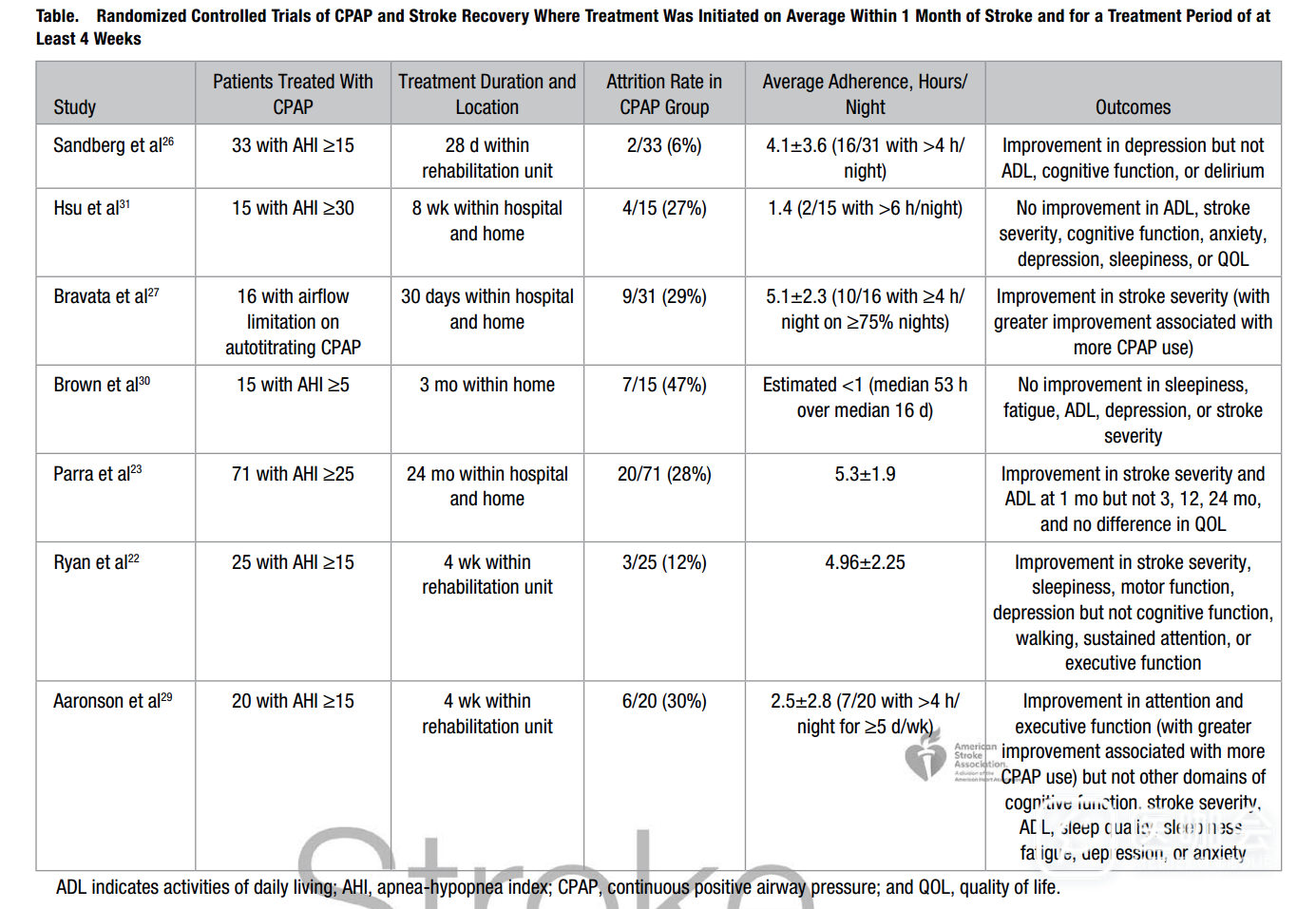 尽管结果不尽相同,但对包含近400名OSA合并缺血性卒中患者的5项研究进行的汇总分析显示,与没有进行CPAP治疗的患者相比,CPAP在短期内改善了患者的神经功能。