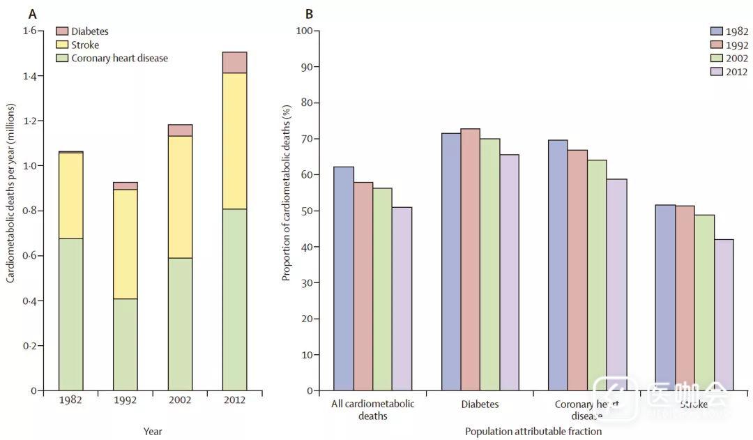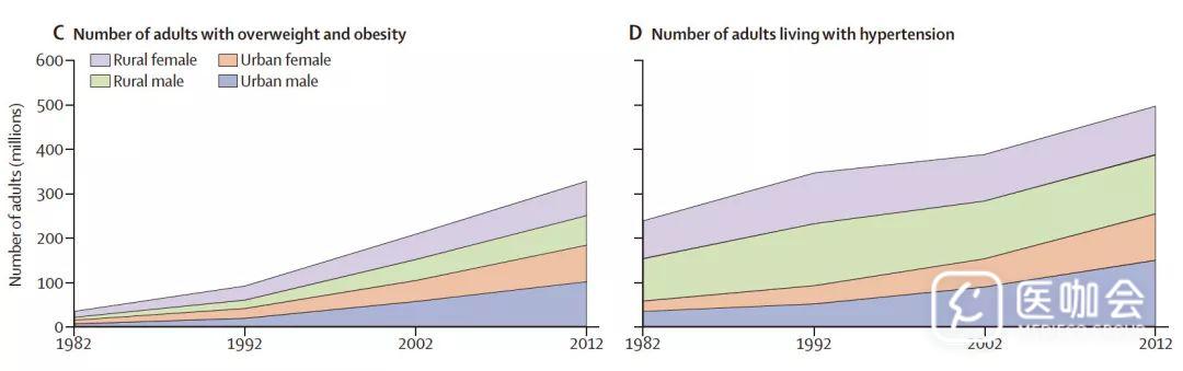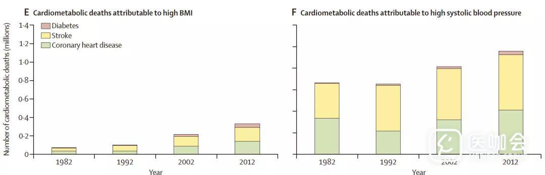 超重/肥胖和高血压人数明显增加,其中1982年,因BMI过高而导致的心血管代谢死亡人数为7万,因收缩压升高而死亡为77万。到2012年,高BMI导致的心脏代谢死亡人数增加到了33万,而高收缩压导致的死亡人数增加到了111万。