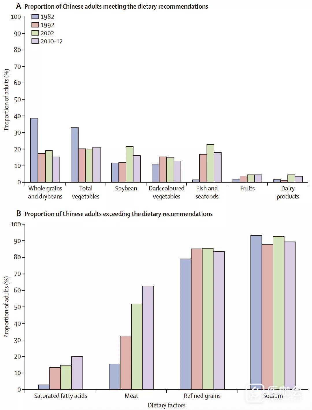 从1982年到2012年,达到全谷物和蔬菜最低推荐标准的中国成年人比例显著下降,超过肉类和饱和脂肪最高推荐标准的比例大幅上升 (图2)。