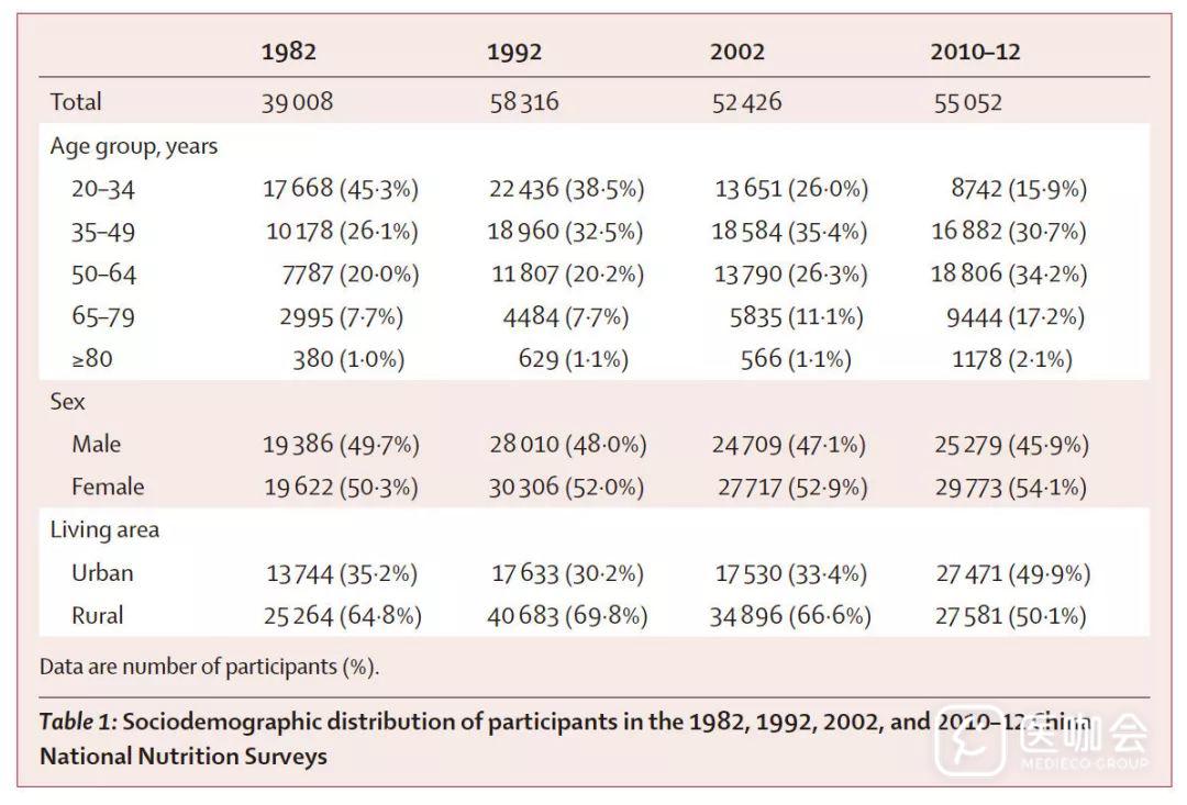 图1:1982、1992、2002和2010-12年全国营养调查参与者的人口分布特点