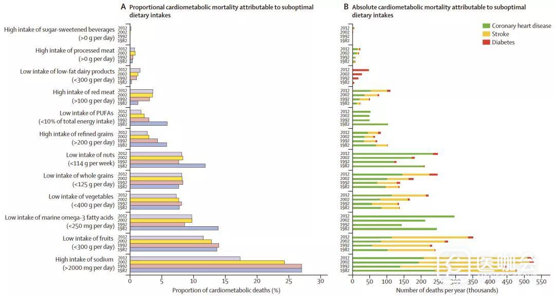 图3:与单个饮食不达标相关的心脏代谢死亡归因(1982-2012):死亡率(A)和绝对人数(B)