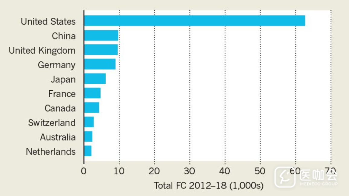 不论是资金投入还是高质量研究产出,美国在生物医学研究中处于领先地位,不过这两者近年来都有所下降。如果使用Nature Index的FC指标来衡量高质量生物医学科研产出,2012年到2018年,中国增加了141.2%,远超其他国家。