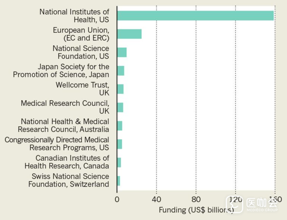 关于生物医学研究的资金投入,对一些主要机构进行了对比(下图缺乏中国的数据)。