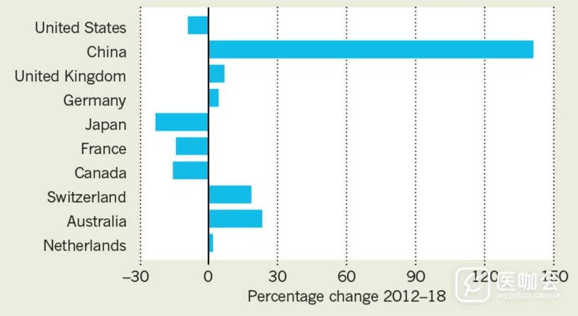 2012年至2018年期间,在该领域,国际合作文章的占比从37.5%增加到44%,而单一机构产出的文章占比,则从31%下降至23%。由于中国科研产出的大幅增加,美国在生物医学研究的领先优势正在缩小。