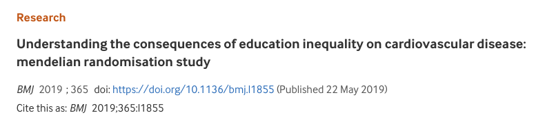 参考文献:Understanding the consequences of education inequality on cardiovascular disease: mendelian randomisation study. BMJ. 2019 May 22;365: l1855