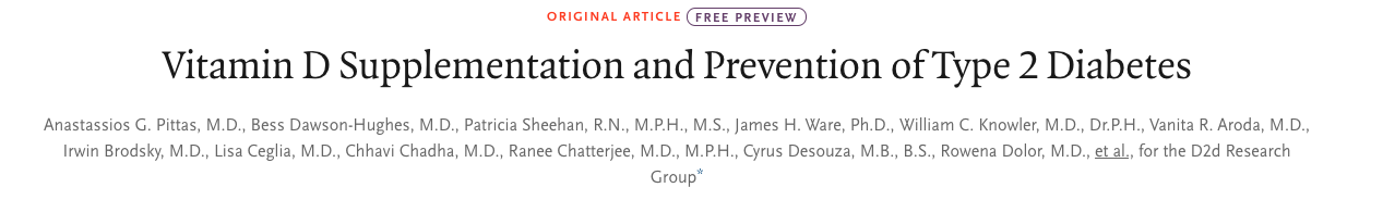 NEJM发表的这项试验(D2d试验),是众多试验中规模最大的一个,众人对该研究的结果也期盼已久。D2d试验研究了维生素D补充剂是否可以延缓糖尿病前期人群的2型糖尿病发生。