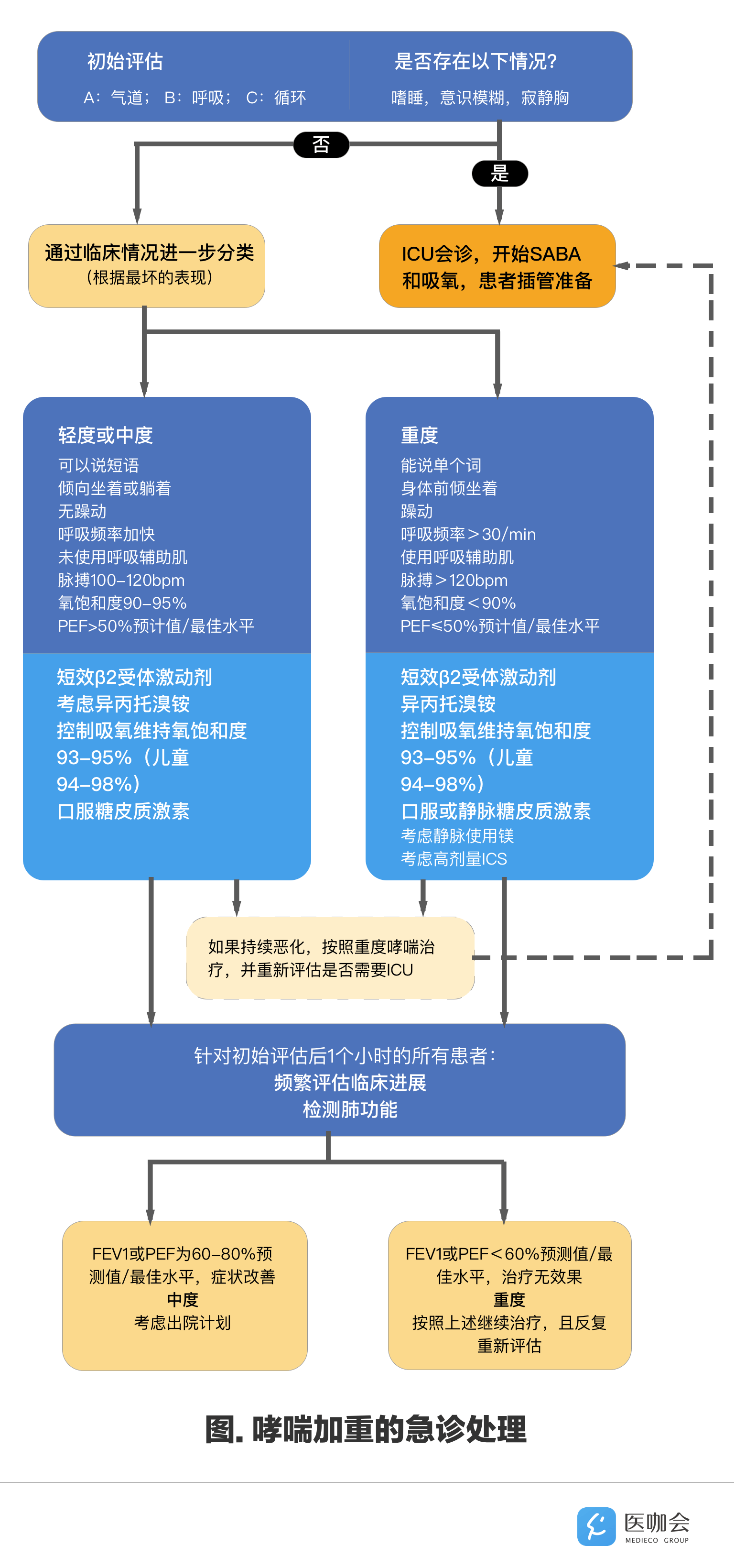 ----(1)依据呼吸困难程度、呼吸频率、脉搏、氧饱和度、肺功能来评估急性加重的程度,同时起始氧疗和SABA治疗。