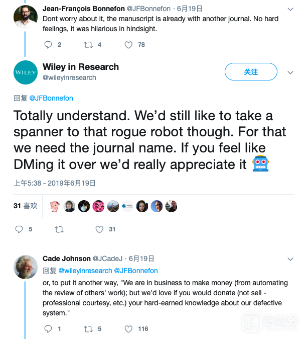 尽管在Twitter的帖子中,Wiley(美国的一个论文数据库)表示希望调查这个问题,但Bonnefon没有透露他提交论文的期刊的名称。根据Wiley全球通信和媒体总监 Tom Griffin的说法,Wiley在回复一条现已删除的推文时发送了希望调查这个问题的意向,因为该推文指出Wiley是该期刊的出版商。