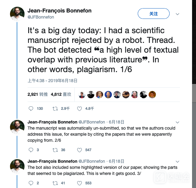 近期,法国国家科学研究中心的Jean-FrançoisBonnefon博士在Twitter上发文说,他提交给期刊的稿件,由于自动化检测工具识别出有抄袭问题而被拒稿(rejected by a robot)。自动识别程序重点指出论文的研究方法、参考文献和作者单位等存在剽窃行为。