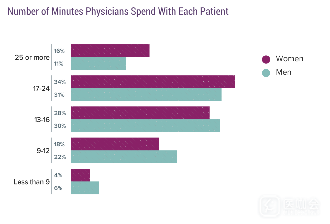今年的报告显示,一半的女医生看单个病人的平均时间≥17min,这一分组的男医生为42%。报告发现,与男医生相比,女医生每周总的看诊时间较少,但看单个病人的时间更长。