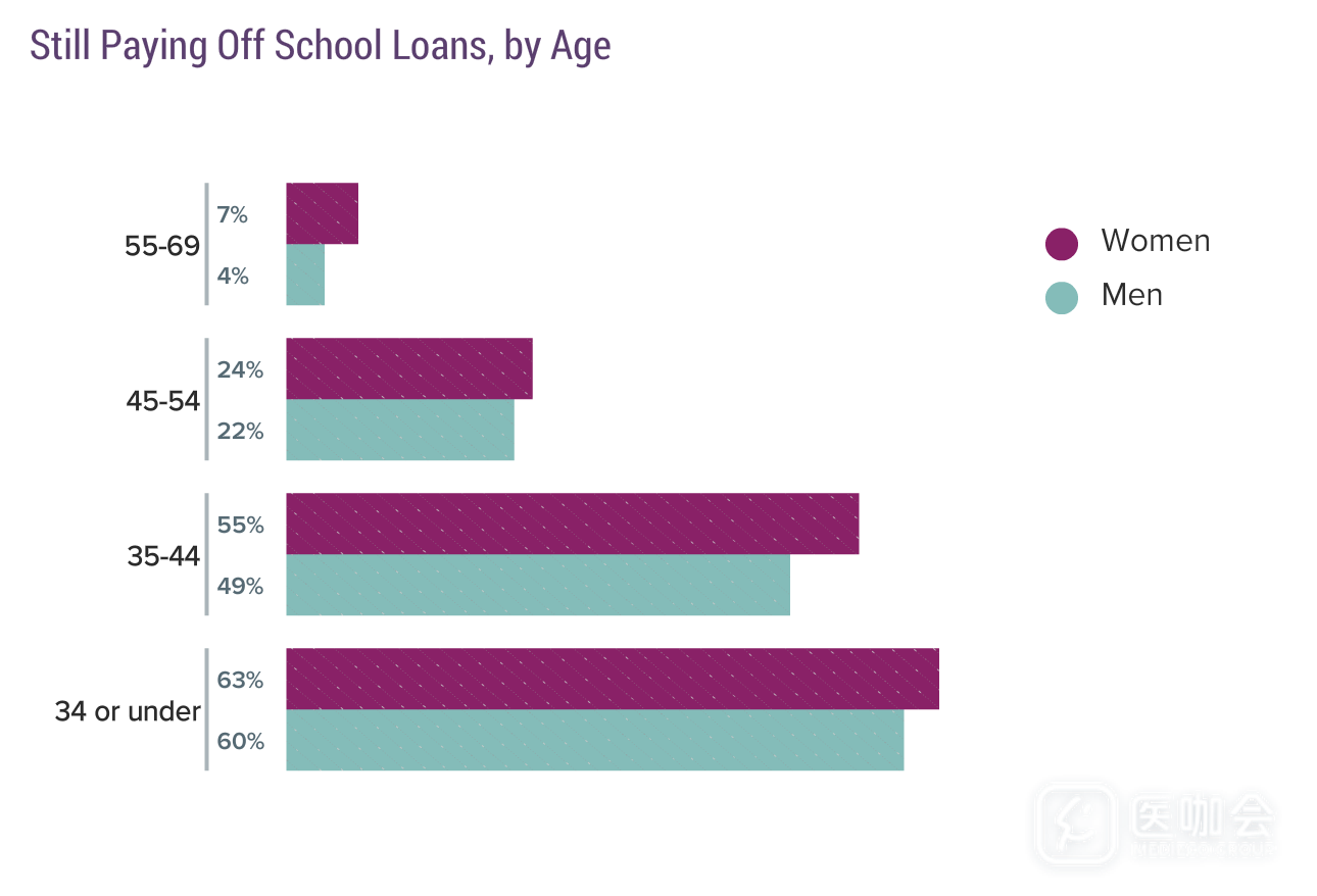 不论什么年龄,女医生偿还学业贷款的比例均高于男医生。随着年龄的增加,仍在偿还学业贷款的医生比例逐渐降低。