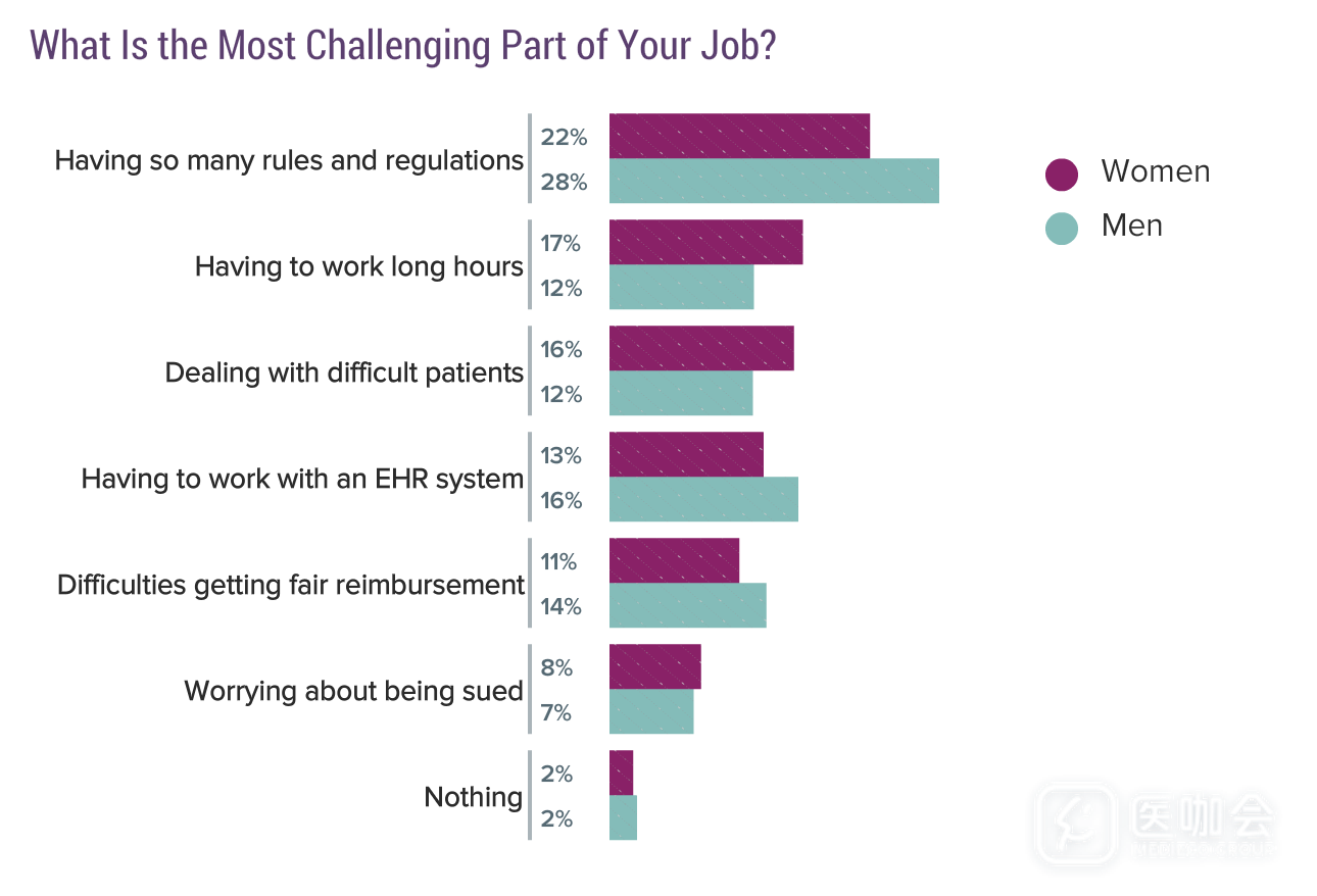 谈到医生工作中的挑战,男医生和女医生的回答有所差异。男医生更倾向于认为是规章制度带来的挑战,而女医生认为工作时间长和处理棘手患者压力更大。