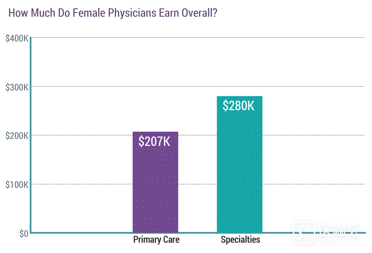 2019年,女医生的平均年收入高于2018年。2018年,女性初级保健医生(PCP)的收入为203000美元,专科医生(specialists)收入为263000美元。