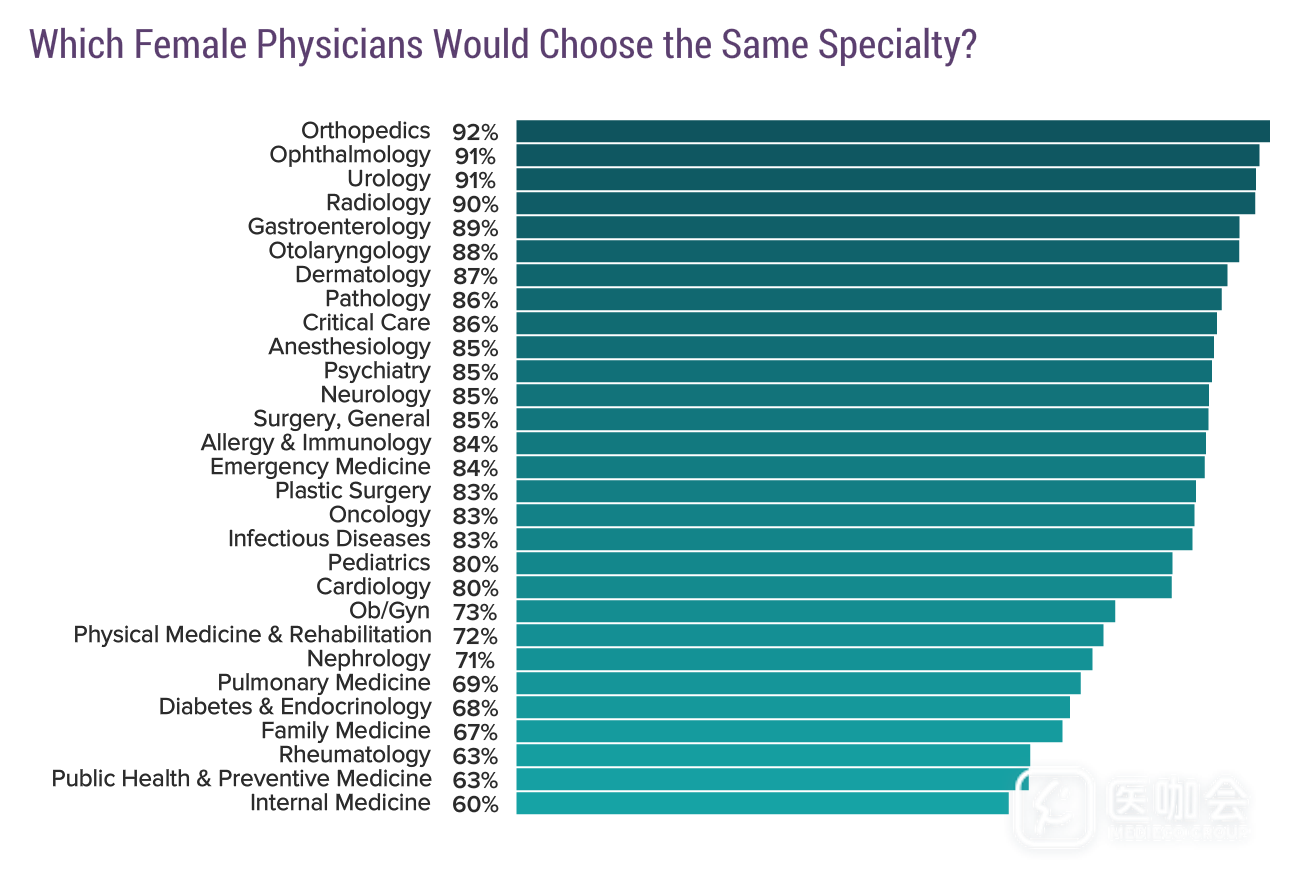 在还选择当医生的女医生中,大部分骨科、眼科、泌尿科、放射科医生会再次选择相同专科。而风湿科、公共卫生与预防医学、普通内科医生选择相同专科的比例最低。