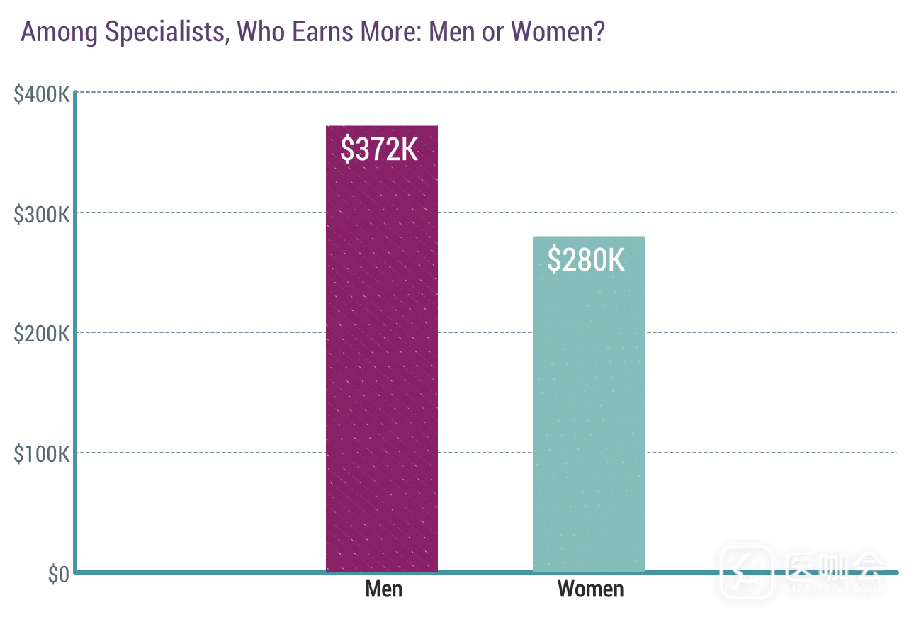 男女专科医生的收入差距很大。男性专科医生的收入比女性高33%,比总体上男女医生的收入差距要大,后者为25%。