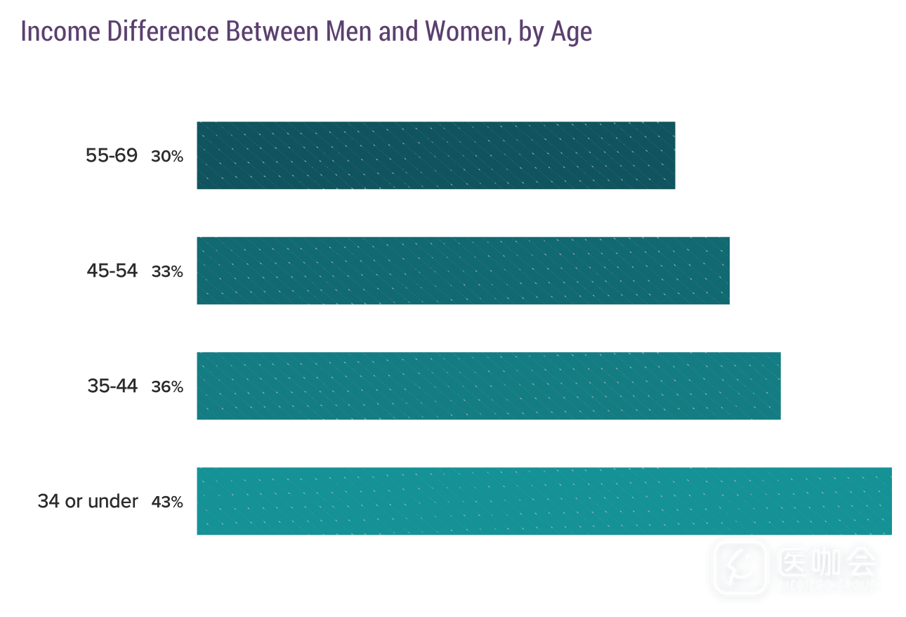 年龄较低的两组医生中,男、女医生的收入差距更大。随着年龄的增加,收入差距逐渐减少。