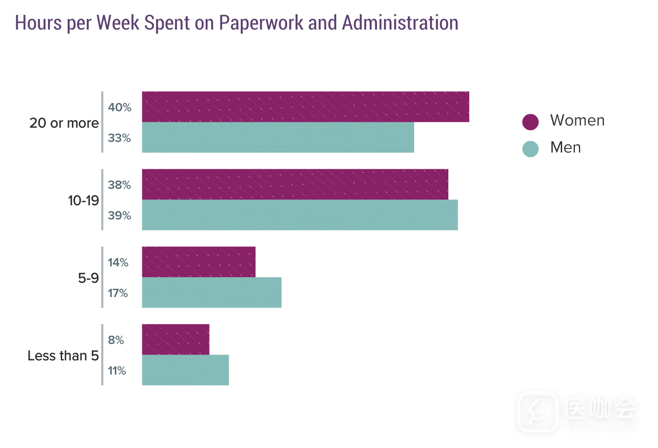 行政文书类工作一直是男医生和女医生的烦恼。78%的女医生表示,她们每周超过10小时花在文书上面,而男医生这一比例为72%。与去年相比,比例都有所增加。
