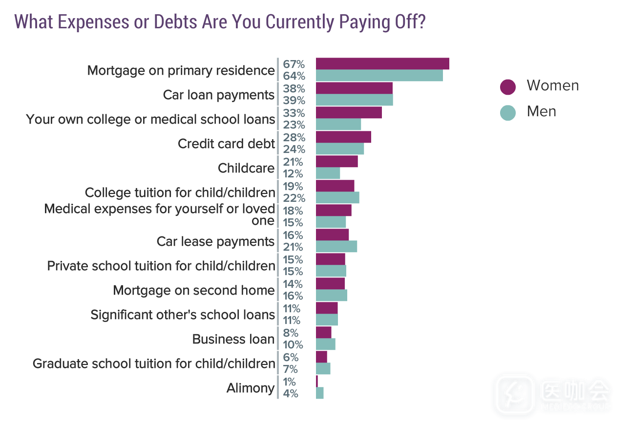 和Medscape之前的报告数据一样,房贷、车贷、信用卡还款、学业贷款是男医生和女医生主要的支出。