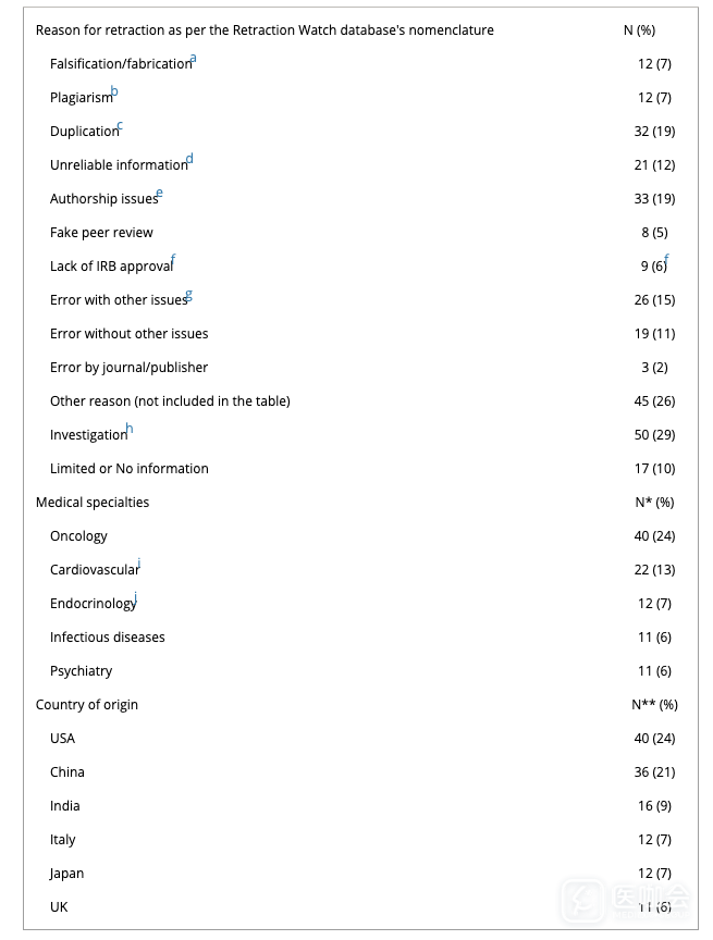 最终检索到655篇撤稿文章,排除485篇文章,最终有170篇撤稿文章纳入分析。表1显示了这170篇文章被撤稿的原因。