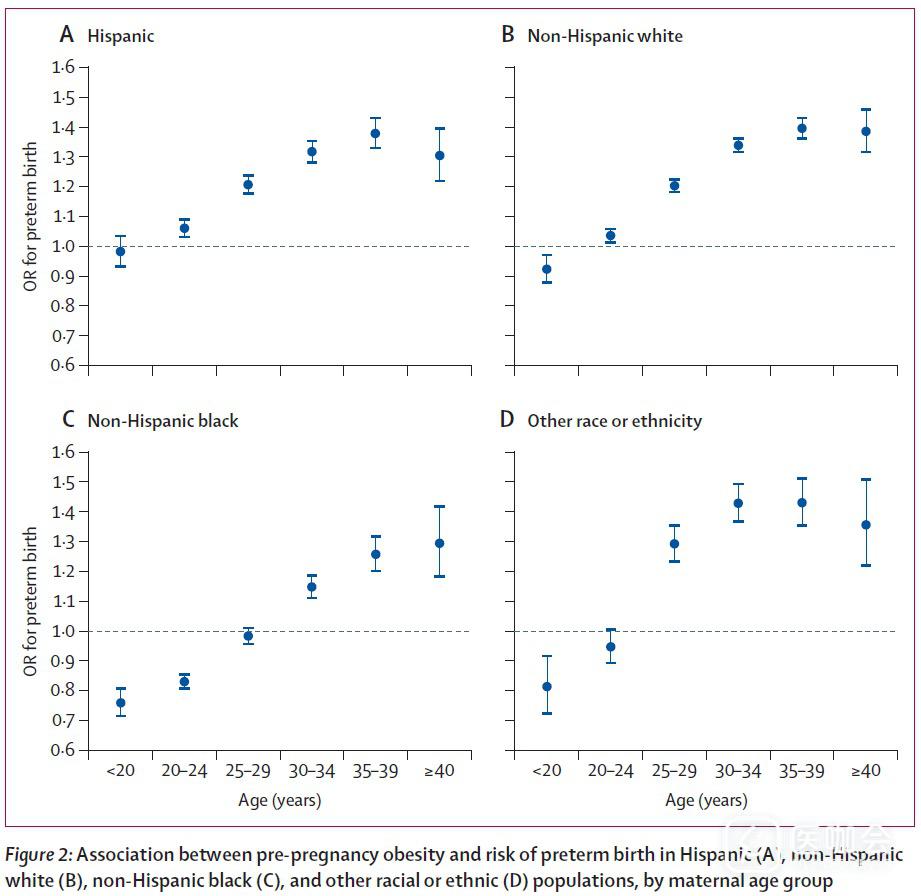 在所有种族中,早产的OR值随着年龄增加而增加(图2)。