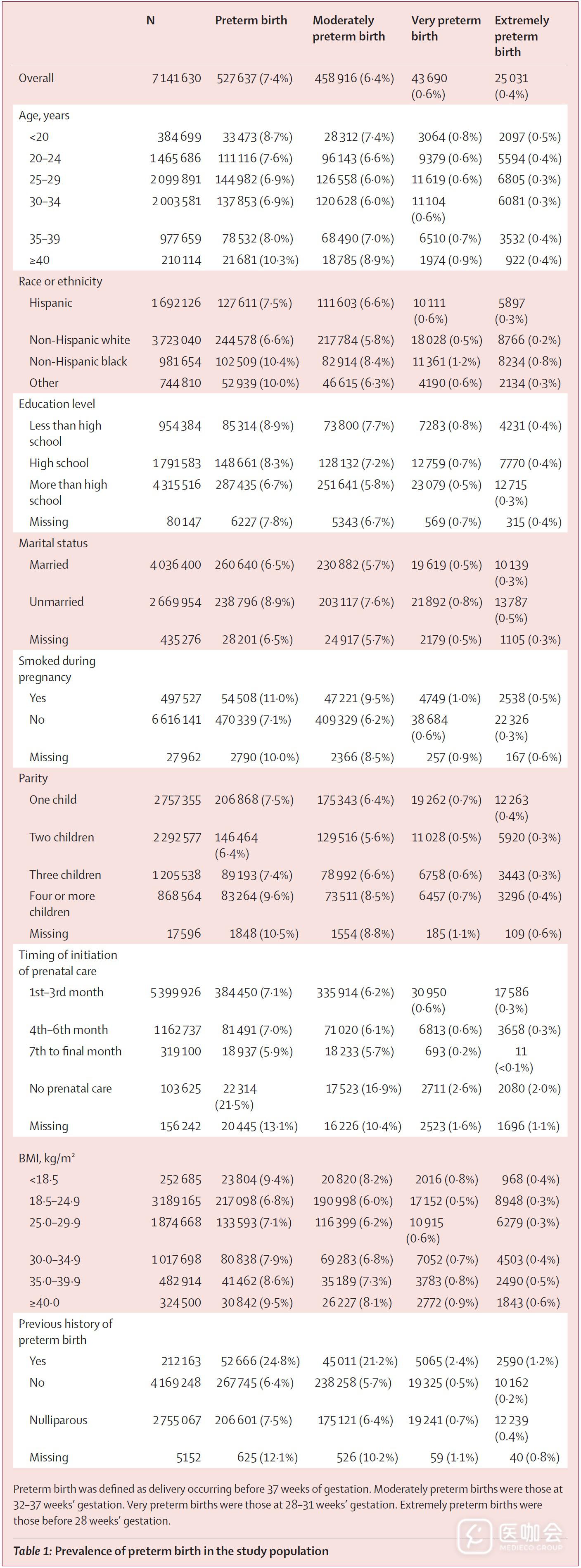 研究最终样本量为7141630,包括527637例早产(7.4%),1825112(25.6%)的女性孕前肥胖。以下情况中早产儿的比例更高:小于20岁或者大于40岁的孕妇,早产儿比例要高于其他年龄组;未婚女性高于已婚女性;教育程度低的女性高于教育程度高的女性;怀孕期间吸烟的女性高于不吸烟的女性;BMI低于18.5 kg/m2或高于40 kg/m2的女性,早产儿比例要高于其他BMI的女性。详见表1。