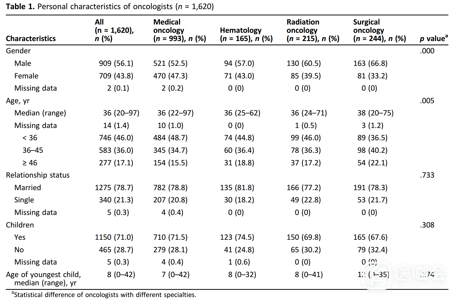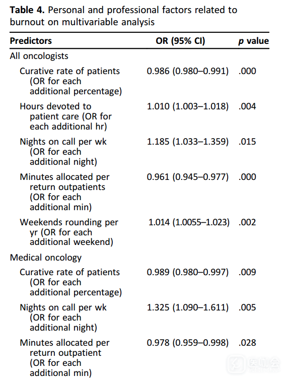 研究人员还调查了不同专科与职业倦怠相关的因素。对于血液科来说,职业倦怠的危险因素是每周总工作时间过长,其他专科的肿瘤医生相对来说,这不是一个显著因素。对于放射科,孩子年龄过小和个人时间过少,与职业倦怠存在相关性(表4)。