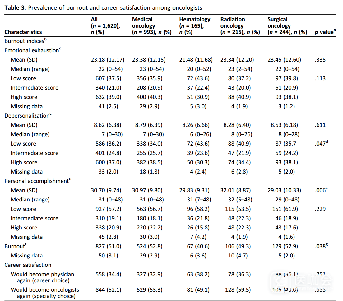 总体来看,827名(51%)医生至少有一种倦怠相关症状(EE评分高和/或DP评分高)。肿瘤内科医生的职业倦怠率略高于放射科医生(52.8% vs. 49.3%;p =0.026)。