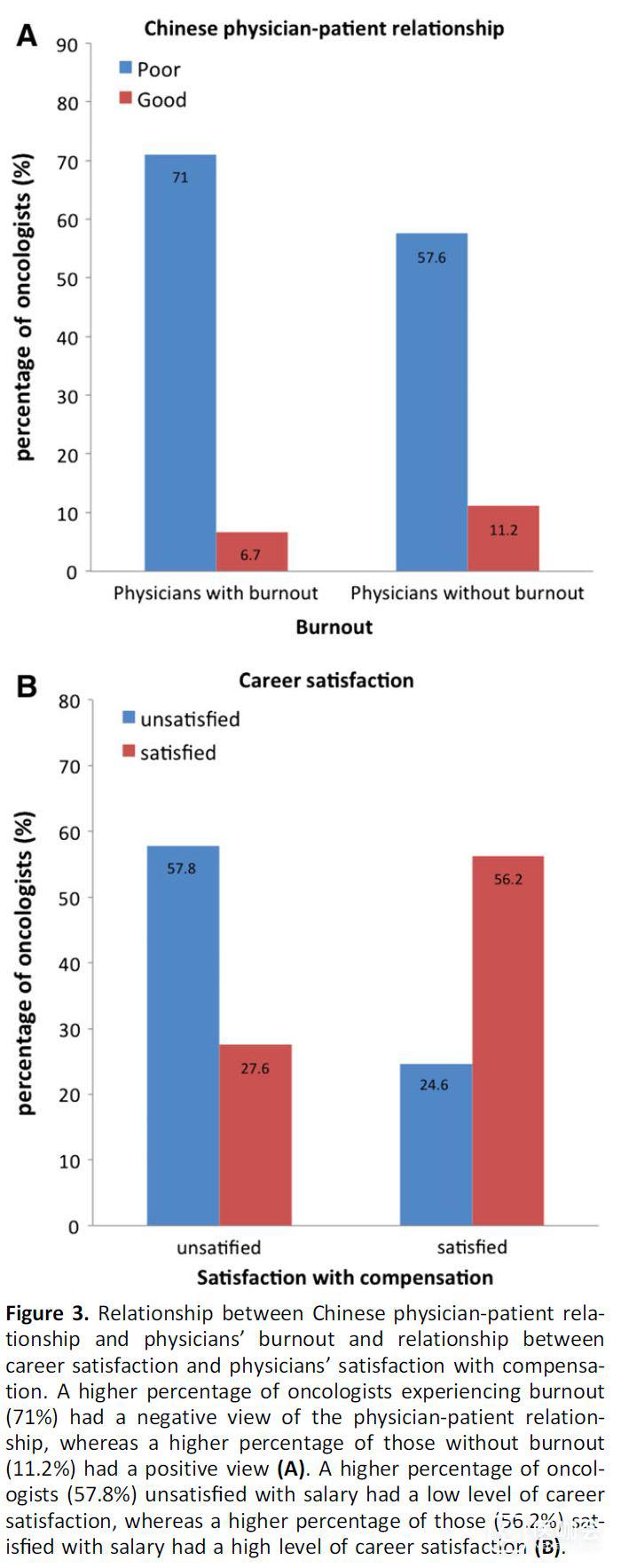 医患关系是当前中国医疗卫生体系面临的重大挑战。该研究表明,医生的职业倦怠与较差的医患关系强相关。进一步分析显示,对医患关系持负面看法的医生,出现职业倦怠的比例较高(图3)。