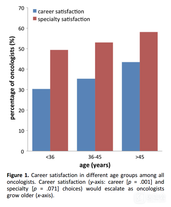 相当多的医生表示,如果可以重新选择的话,他们不会再选择成为医生(47.7%)或肿瘤领域医生(26.1%)。以这两个因素来衡量医生的职业满意度,远低于其他国家。不同专科间的选择无明显差异(表3)。对不同年龄组进行的亚组分析显示,更年轻的医生,其职业满意度更低(图1、表3)。