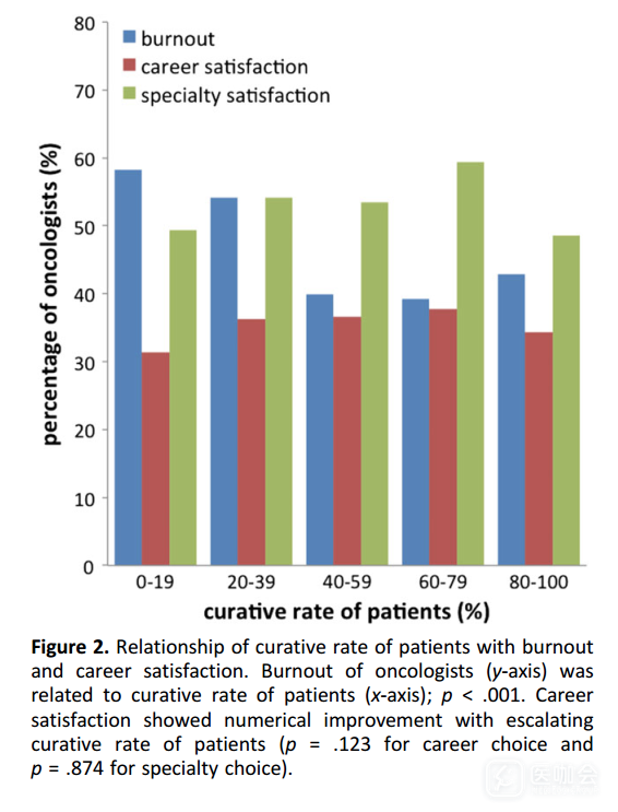 整体数据显示,医生工作负担重与职业倦怠呈强相关关系。与职业倦怠相关的主要因素包括:肿瘤患者的治愈率低(图2)、花太多时间在患者诊疗上、每周夜班次数多、很多节假日被工作占用等。