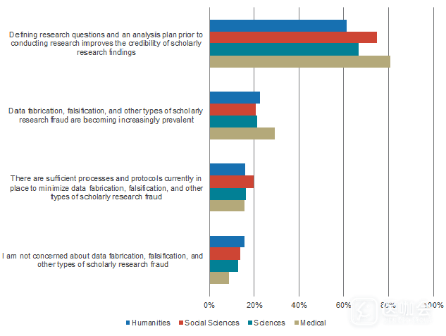 在398名医学研究人员中,大约有三分之二担忧数据伪造、篡改数据和其他类型的学术欺诈行为(图3),这一比例高于其他领域,例如社会学领域(45%)和人文领域(44%)。此外,大约30%的医学研究人员认同学术不端的情况变得越来越普遍,明显高于其他学科的研究人员(约20%)。