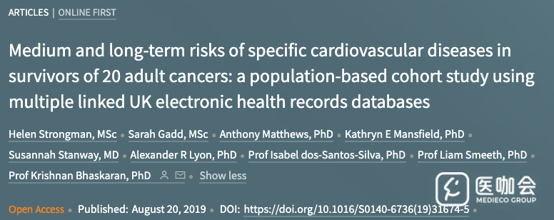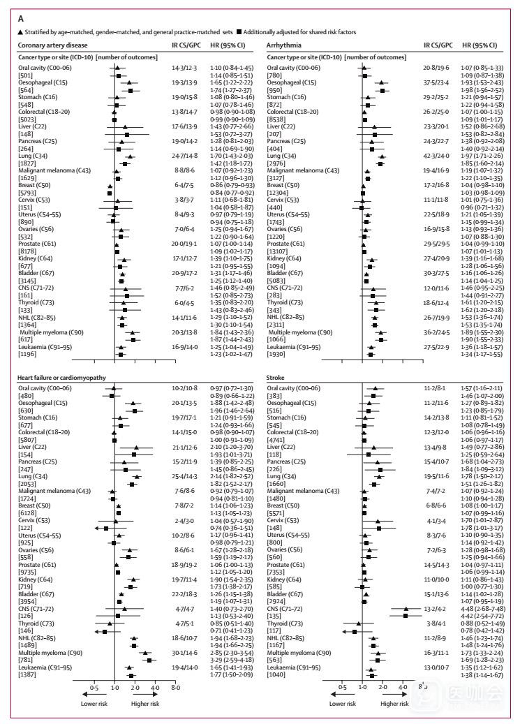 这项基于人群的队列研究,使用了英国临床实践研究数据链(CPRD)相关联的初级诊疗机构、医院和癌症注册登记数据,确定了20种最常见癌症的幸存者队列,年龄在18岁以上,在诊断后至少存活12个月,匹配的对照组人群没有癌症病史,通过年龄(±3岁)、性别和全科诊所进行匹配对照。使用Cox回归模型比较两组患者的一系列心血管疾病的风险。