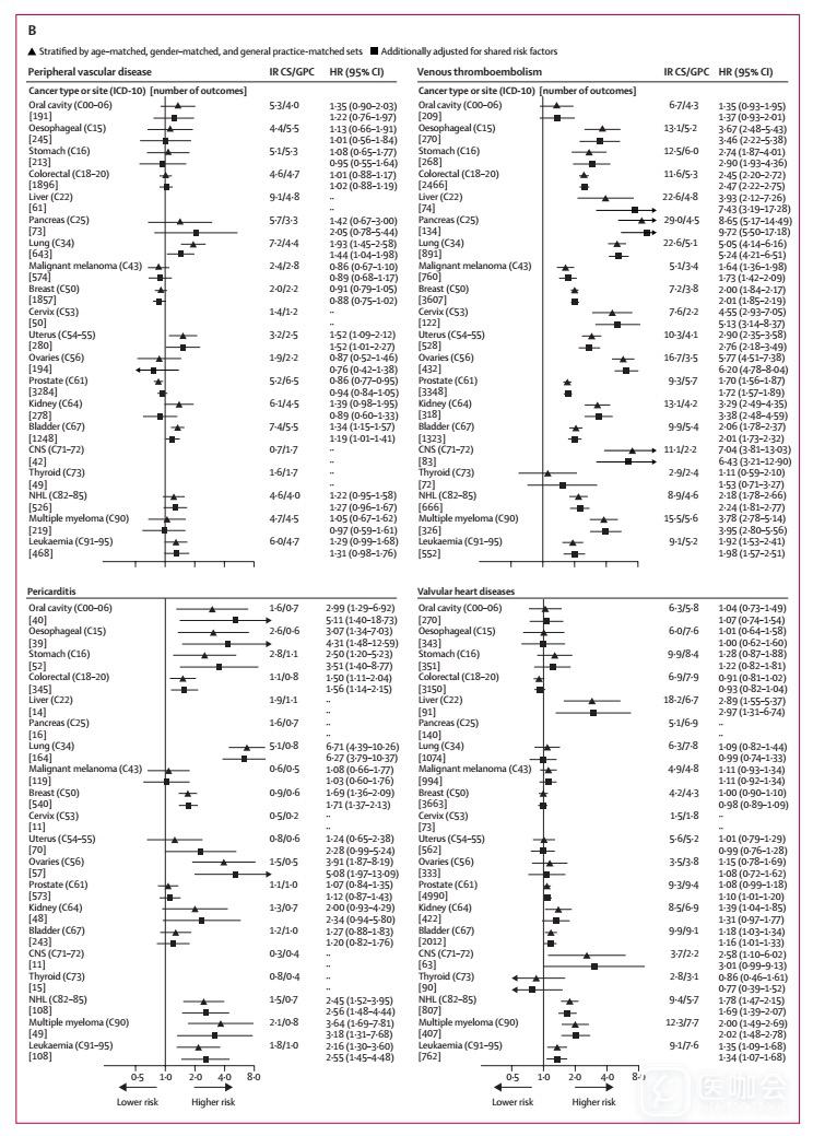 20种癌症中,有18种癌症的静脉血栓栓塞风险增加,调整后的HR从前列腺癌患者的1.72到胰腺癌患者的9.72。其它多种癌症的心律失常、心包炎、冠状动脉疾病、卒中和心脏瓣膜病风险也增加。