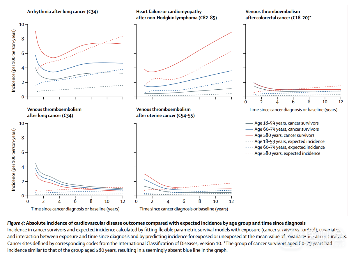 图4. 癌症患者心血管疾病的绝对发病率与该年龄组的预期发病率