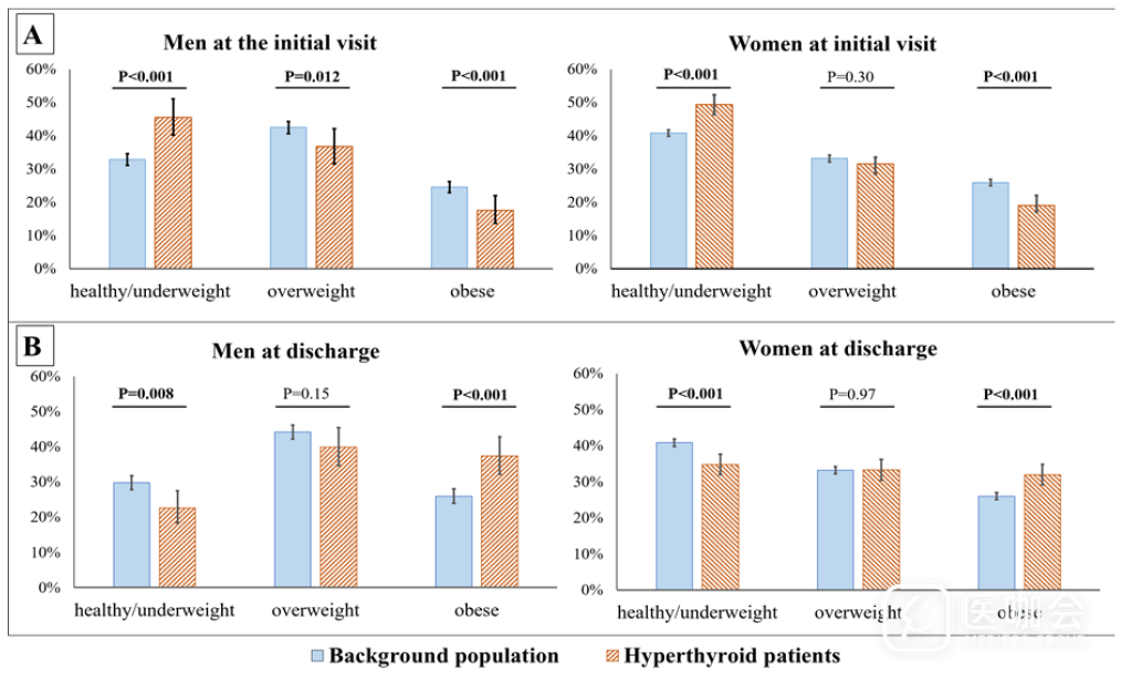 在末次随访时,与背景人群相比,甲亢队列肥胖男性(26% vs 37%, P<0.001)及女性比例(26% vs 32%, P<0.001)明显更高(图1B)。