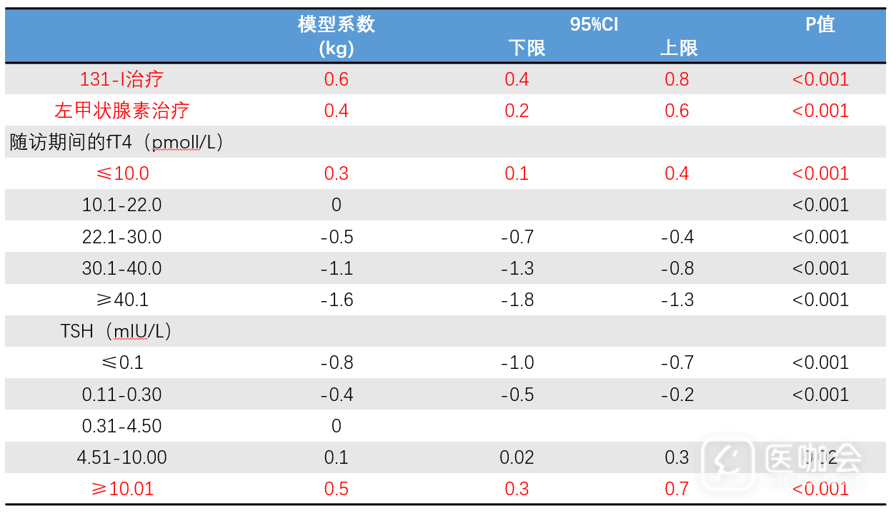 - 在随访过程中,较甲功处于正常参考范围的患者相比,TSH显著升高(>10 mIU/L)可增重0.5kg(P<0.001),fT4水平下降(≤10 pmol/L)可增重0.3kg(P<0.001)。