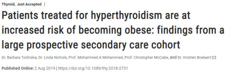 基于上述问题,最近在Thyroid杂志上发布一项研究,试图去探讨到底甲亢治疗是否会增加肥胖的风险。
