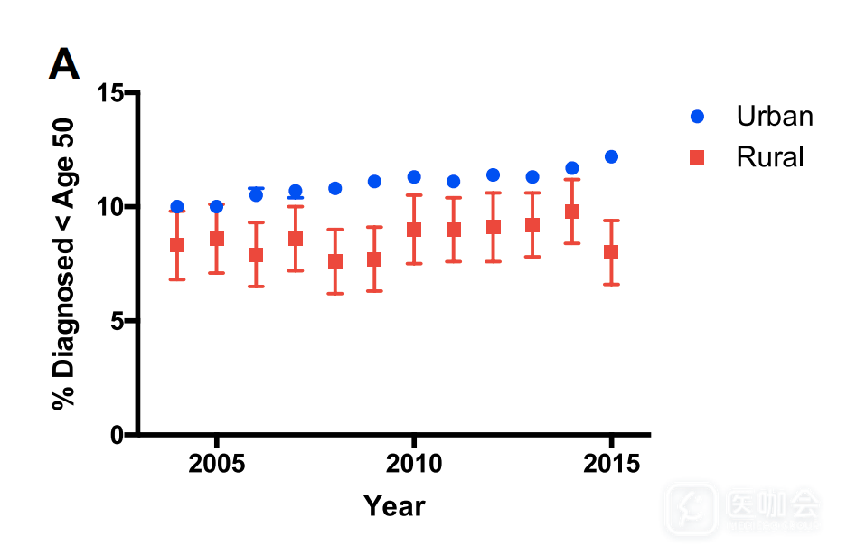图1. 2004年至2015年,美国50岁以下人群中结直肠癌病例比例有所上升(城市和农村对比)