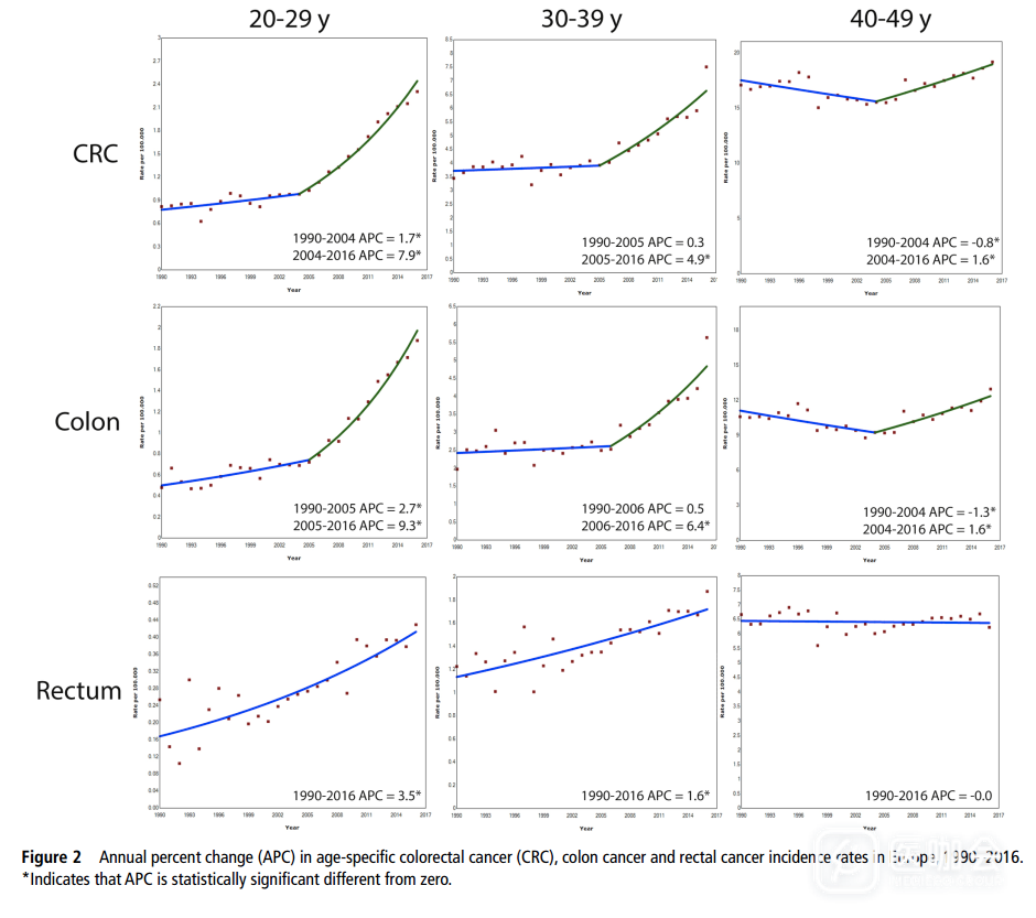 同样,一项对20个欧洲国家的研究 [4] 发现,在过去10年里,20多岁的人结直肠癌的发病率每年增长近8%,30多岁的人增长5%,40多岁的人增长1.6%。(图2)